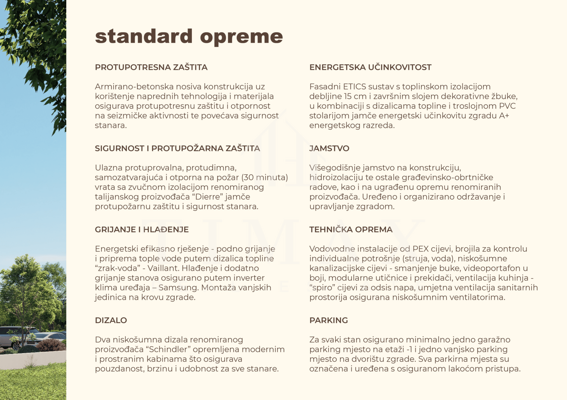 U iskazane cijene je uključena stavka PDV-a te kupac NE plaća porez na promet nekretnina i agencijsku proviziju. Parkirna mjesta i spremišta nisu uključena u cijenu stanova – uz svaki stan obvezna kupnja jednog spremišta te jednog garažnog i jednog vanjskog parkirnog mjesta.